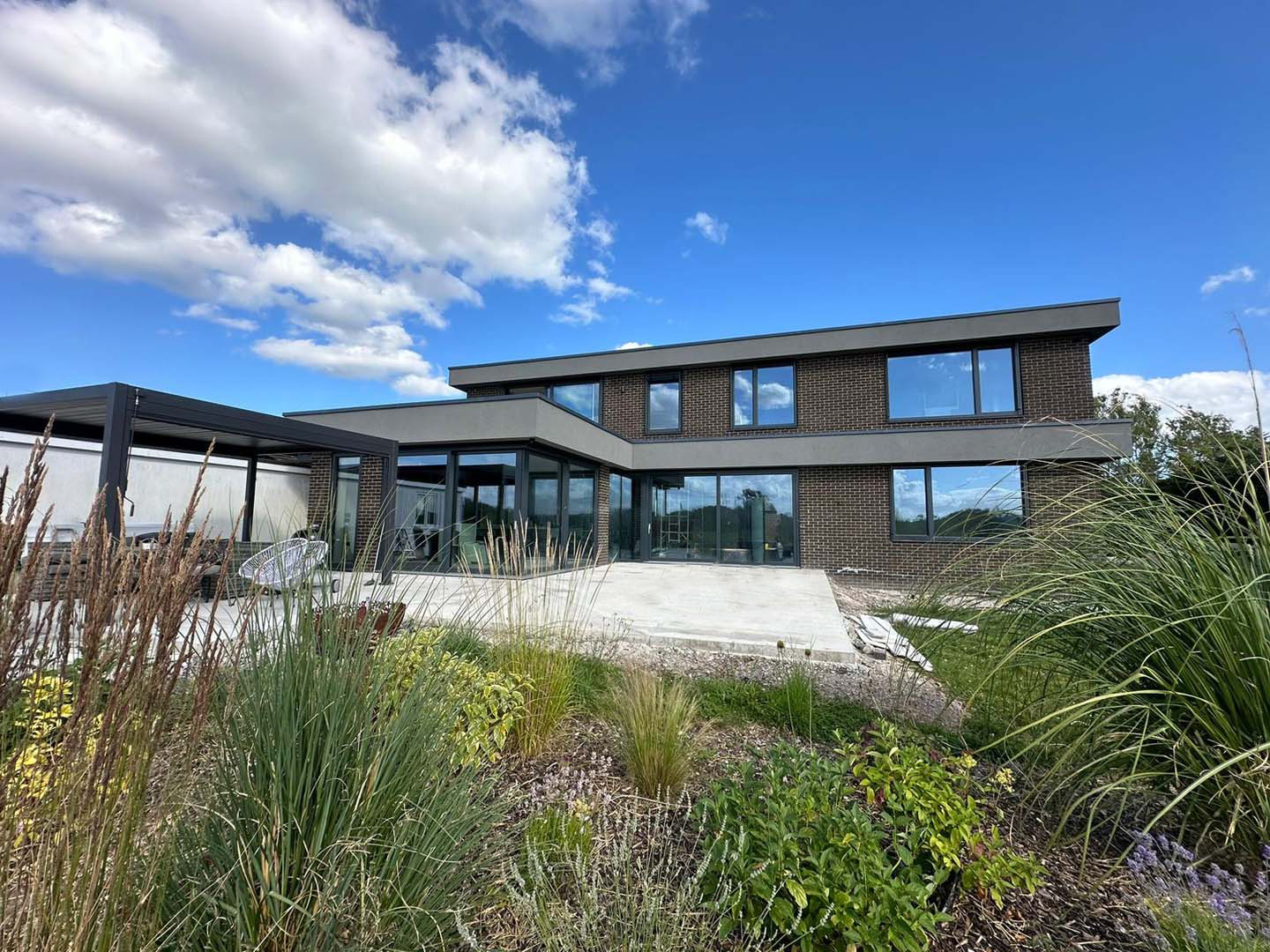 In addition, the project features a wide range of innovative measures, such as recessed external blinds to prevent over-heating or concealed internal insect screens to allow the doors to be left open. The house is underpinned by a series of low energy measures from triple glazing, underfloor heating, air source heat pump, photovoltaic panels, battery storage to water storage tank. The Swiss Kachelofen is a particular delight and a “home comfort” our Swiss client wanted and with our Bavarian background we knew all about it.